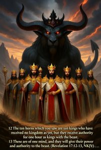 12 Десять рогів, що ти бачив, це десять царів, які ще не отримали царства, але отримають владу як царі на одну годину зі звіром. 13 Вони мають одну думку, і силу свою та владу дадуть звірові . (Об’явлення 17:12-13)
