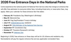 Otros días que ahora serán gratuitos incluyen el Día de los Presidentes, el Día de los Caídos, el fin de semana del Día de la Independencia, el 110.º aniversario del Servicio de Parques Nacionales, el Día de la Constitución y el cumpleaños del presidente Theodore Roosevelt. Otros días que se eliminaron del programa incluyen el primer día de la Semana de los Parques Nacionales, el aniversario de la Ley de Grandes Espacios Abiertos de Estados Unidos y el Día Nacional de las Tierras Públicas.