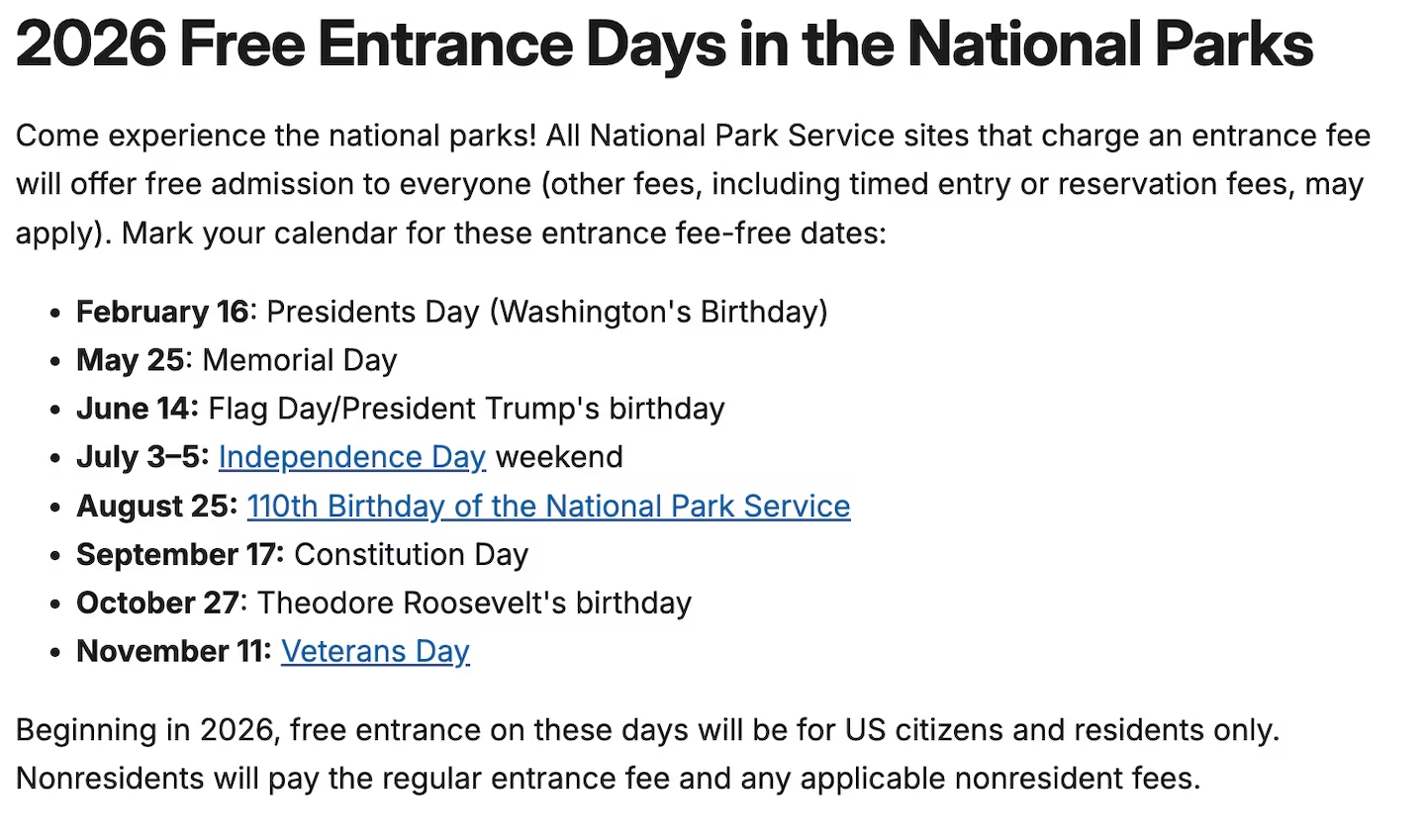 Otros días que ahora serán gratuitos incluyen el Día de los Presidentes, el Día de los Caídos, el fin de semana del Día de la Independencia, el 110.º aniversario del Servicio de Parques Nacionales, el Día de la Constitución y el cumpleaños del presidente Theodore Roosevelt. Otros días que se eliminaron del programa incluyen el primer día de la Semana de los Parques Nacionales, el aniversario de la Ley de Grandes Espacios Abiertos de Estados Unidos y el Día Nacional de las Tierras Públicas.