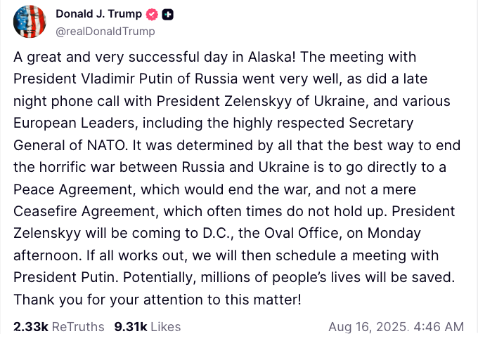 Después de casi tres horas de conversaciones, el presidente Trump dijo: ” Se acordaron muchos puntos y solo quedan unos pocos “, pero no dio detalles, mientras que Putin reiteró las demandas de línea dura de Rusia de concesiones territoriales ucranianas, desarme, exclusión de la OTAN y cambio de régimen en Kiev. https://www.zerohedge.com/markets/history-making-summit-alaska-trump-en-route-meet-putin-everything-you-need-know
